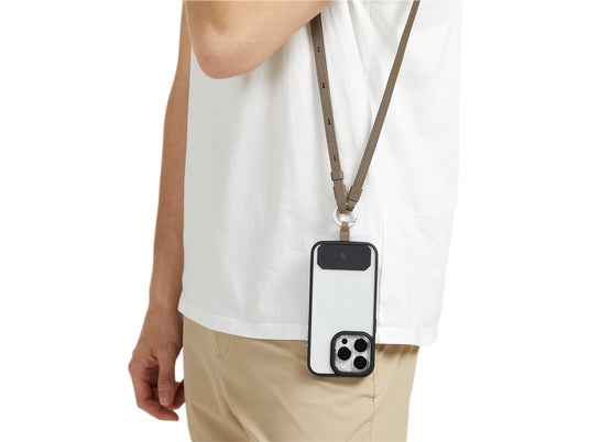 スマートフォンスリング ― ポケットに無理に詰め込む必要はありません。スマートかつ機能的に、必需品を持ち運びましょう。レザー製のスリングにはマグネット式の開閉機構と、カードを収納できるバックスリーブが備わっています。 13,200円(税込)