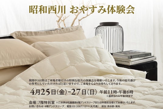 “寝心地の違い”をその場で実感!【昭和西川】おやすみ体験会開催!を4/25(金)~27(日)、松屋銀座7階特別室にて開催<3日間限定>