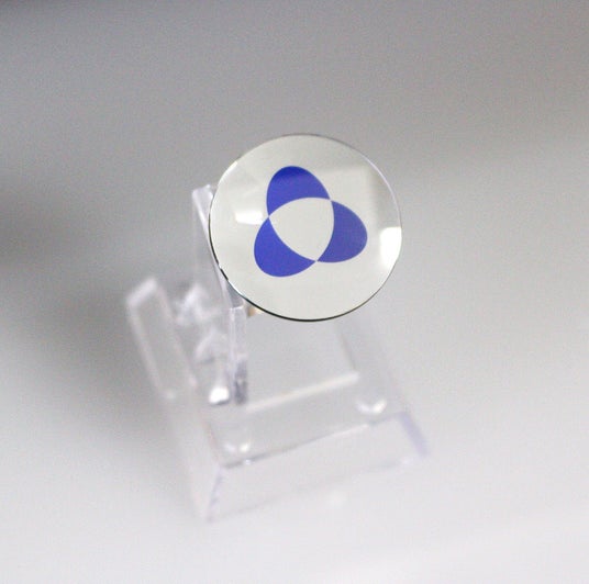 <輝く社章がクール!製作中に出た半端サイズのサファイアガラスで作られているのでSDGsの視点でも◎>