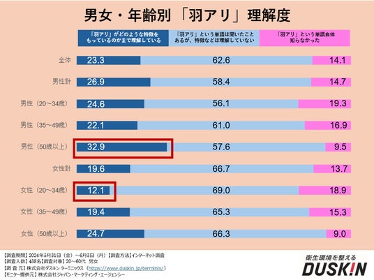 また、羽アリについて正確に理解している人を男女別で分析すると、男性の50 歳以上は32.9%と他の性・年齢別よりも高くなっており、女性についても50 代以上は24.7%と全体の23.3%を上回る結果でした。一方で、20~34歳の女性については、理解率が12.1%と男性より⾮常に低い結果となりました。