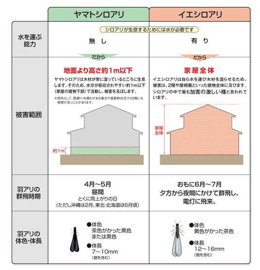 日本には主にヤマトシロアリとイエシロアリの2種類のシロアリが生息し、水を運ぶ能力、被害範囲、群飛時期、体色、体長などに違いがあります。本州南岸以南に生息するイエシロアリは自ら水を運び、木材を湿らすため建物全体への被害が懸念されます。羽アリの出やすい時期に注意して建物周辺を観察しましょう。