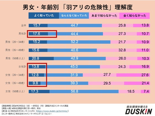 また、男女別でも羽アリの危険性への理解には大きく差がでており、男性計は全体の平均15.7%を上回る17.6%に対して、女性計は13.8%と平均を下回る結果になりました。とくに、20~34 歳女性は12.8%、35~49歳女性は9.8%と⾮常に低い結果となりました。