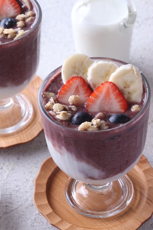 ■ブラジルのスーパーフルーツ アサイー。同店ではこれからの暑い季節にぴったりなシャリシャリ食感の「フローズンアサイー」とバナナや苺、ブルーベリー、グラノーラをトッピングした「ギリシャヨーグルトとアサイーのスムージー」を販売いたします。