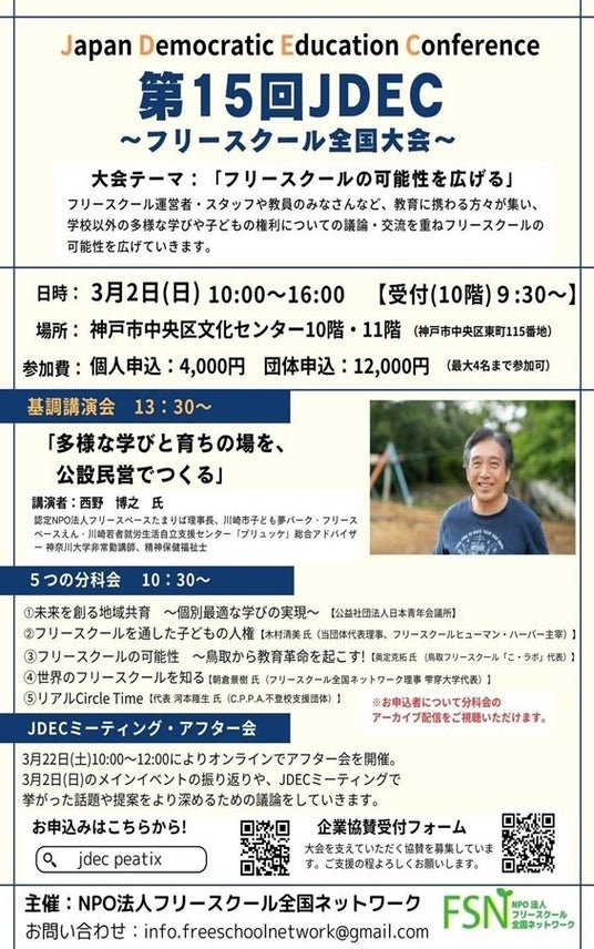 公益社団法人日本青年会議所(所在地:千代田区平河町2丁目14番3号、会頭:外口 真大、以下「日本 JC」)新教育システム創造会議は、2025年3月2日(日)に神戸市中央区文化センターで開催されるNPO法人フリースクール全国ネットワーク主催の「第15回JDEC~フリースクール全国大会~」で分科会を担当いたします。