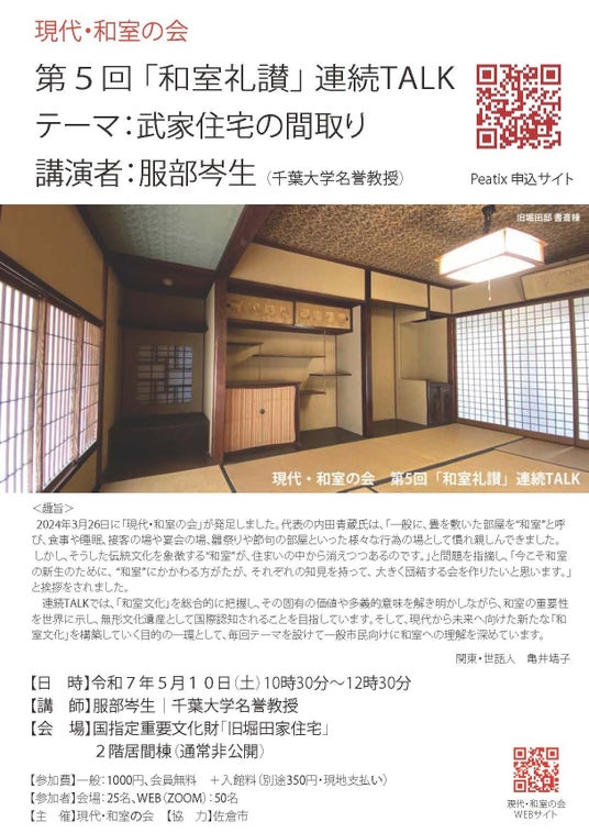 第5回のテーマは「武家住宅の間取り」。佐倉市とも縁が深く、歴史的にも価値の高い武家住宅を題材に、当時の暮らしや空間の工夫について学びます。講演後には、普段は非公開の「書斎棟」の見学ツアーも予定しています。歴史ある建物を間近で体感できる貴重な機会です。