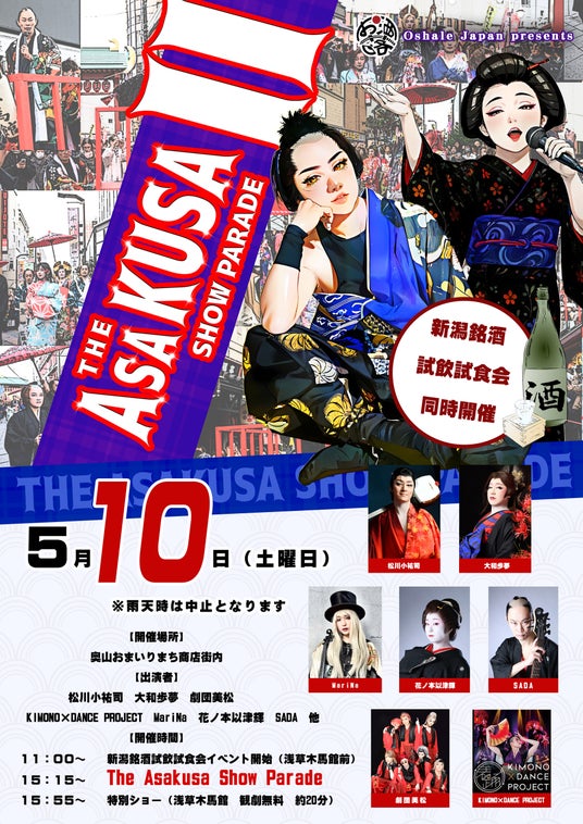 花魁道中やダンス、日本舞踊、音楽の生演奏、大衆演劇の演舞、バイオリンのライブパフォーマンスなど、多彩なアーティストたちが華やかに浅草の街を彩るショーパレードに加え、新潟の隠れた銘酒を味わえる試飲イベントも同時開催します。