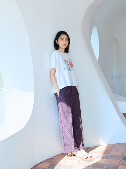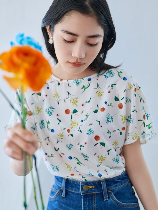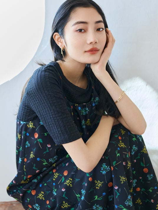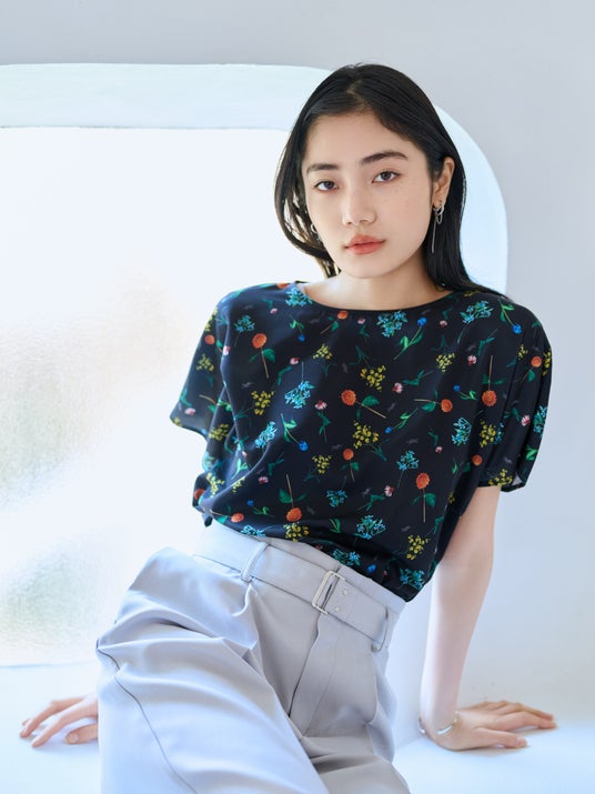 セミマットな質感の素材にフラワープリントの柔らかな色合いが美しく表現されています。軽やかで落ち感のある素材で、動くたびに優雅に揺れ、品のある印象を与えます。