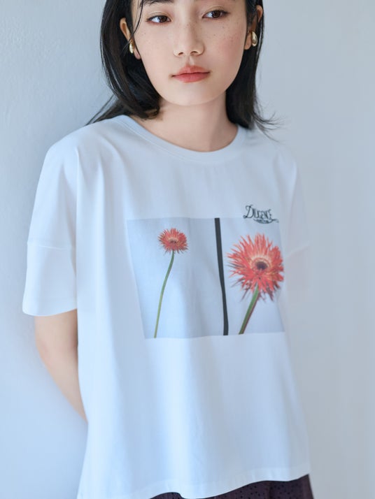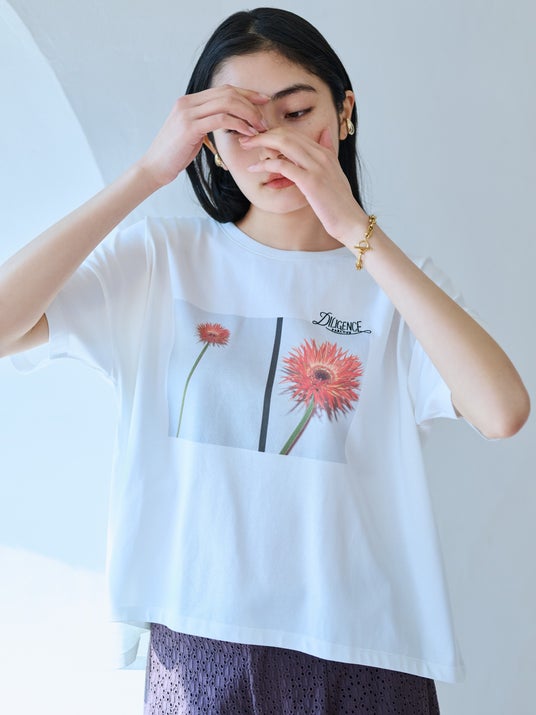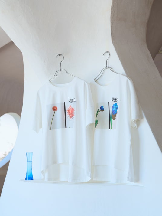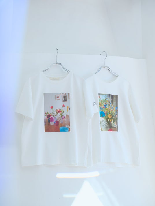 「DILIGENCE PARLOUR」のアートワークから、フラワーベースを用いた美しい色彩のフォトを2種類セレクトしました。インナーとしても1枚着としても活躍するベーシックシルエットで、フィットしすぎないサイジングが魅力。