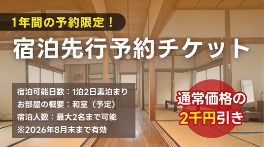 一般予約に先駆けて宿泊予約ができる特別チケット。2025年8月頃のプレオープン以降、年内の都合のよい時期に清水屋旅館をご利用いただけます。