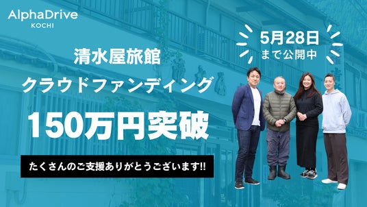株式会社アルファドライブ(代表取締役社長 兼 CEO 麻生要一)の子会社である、株式会社アルファドライブ高知(代表取締役社長 宇都宮竜司、以下 AlphaDrive高知)は、高知県土佐町の老舗旅館「清水屋旅館」の事業承継を行い、新たな町の交流拠点の創出に向け、活動を行っています。その活動の一環として3月28日よりCAMPFIRE上で実施中のクラウドファンディングが、支援額150万円(達成率50%)を突破しました。