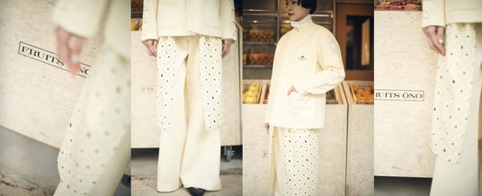 ベルボトム型のクラシックなシルエットをベースにしたスラックスは、身体の動きに沿って滑らかにカーブ。上に重ねるバムフラップは、八百屋で使われてきた前掛けをルーツに、現代的にアレンジ。「FRUITS ŌNO」のロゴを分解してドット状に再構築したグラフィックが散りばめられ、遠目には模様のように、近づくと文字や果物が浮かび上がる視覚的な仕掛けを施しています。