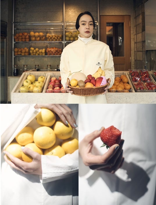 ジャケットは、1980年代のバージャケットの要素を取り入れながら、袖口と胸ポケットに「FRUITS ŌNO」のロゴを配置。連続した袖ボタンは外して開くこともでき、機能美も備えています。