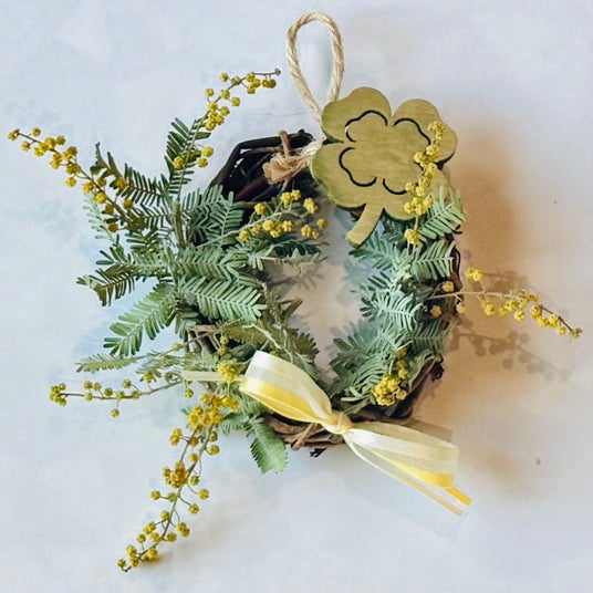 内容:アートキット(ベース用リース、デコレーション素材[ミモザ、リボン、蝶々、 四つ葉のクローバーのウッドパーツ]、作り方を記載した紙、敷き物)