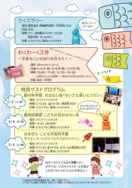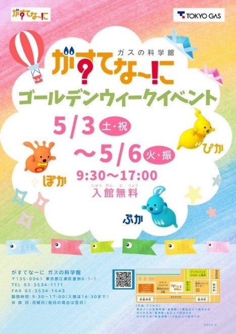 東京ガスの企業館「がすてなーに ガスの科学館」では、5月3日(土・祝)~5月6日(火・振)の期間で『ゴールデンウィークイベント』を開催いたします。“クイズラリー”“わくわーく工作”“特別ゲストプログラム”など盛りだくさん!