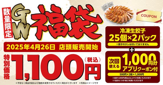 株式会社物語コーポレーション(本社:愛知県豊橋市/代表取締役社長:加藤 央之)が全国219店舗展開中の『丸源ラーメン』は、2025年4月26日(土)より、冷凍生餃子50個とお得なアプリクーポン2枚(1,000円分)がセットになった「丸源GW福袋」を1,100円(税込)で数量限定販売いたします。
