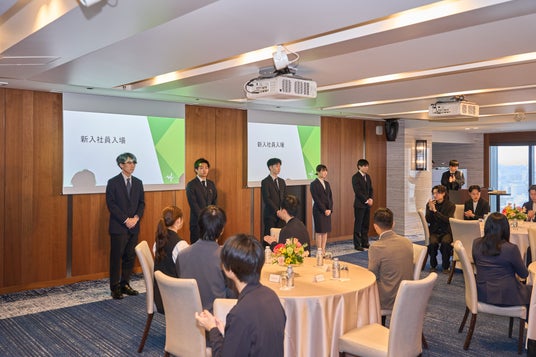 入社式では、新卒社員の採用経緯や会社のこれまでの歴史が紹介されるとともに、