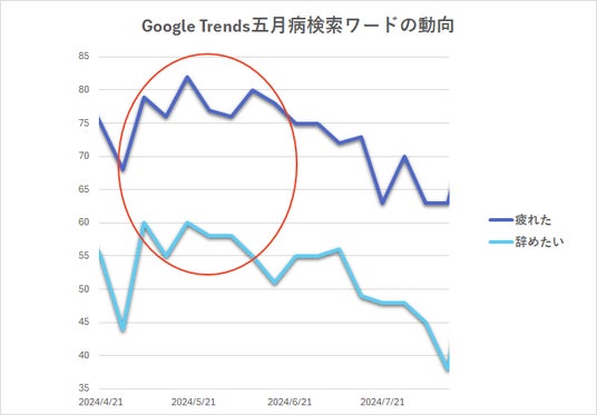- 「五月病」検索数の明確な季節性: 毎年4月下旬から5月にかけて、「五月病」というキーワードの検索数が顕著に増加する傾向が確認されました。