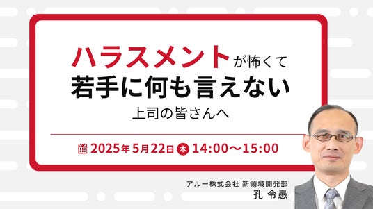 人材育成データ・機械学習技術等を活用した、社会人向け教育サービスの提供を行うアルー株式会社(本社:東京都千代田区 代表取締役社長:落合文四郎、証券コード:7043、以下:当社)は、無料オンラインセミナー「ハラスメントが怖くて若手に何も言えない上司の皆さんへ」を下記のとおり開催します。