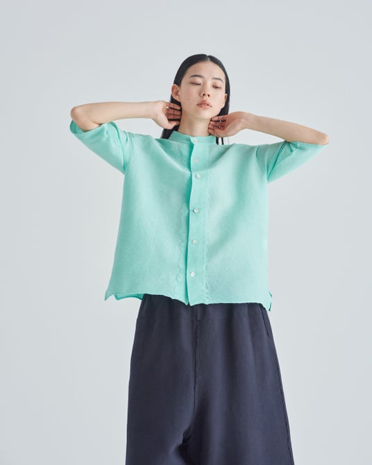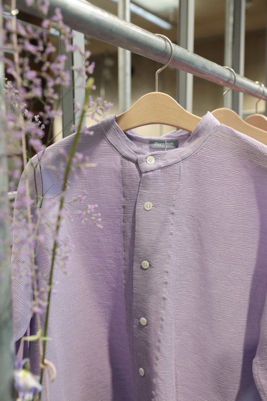 滋賀県北西部に位置する滋賀県高島地域。江戸時代から「高島ちぢみ」と総称される「綿楊柳」 「綿クレープ」と呼ばれる薄手の衣料向け綿織物生地の産地としてその名を馳せてきました。 この高島ちぢみを使用した「楊柳」を発想の転換により横縞に使用したものがPlantationの オリジナル素材である「YOORYUU」です。 生地に適度な張り感と、プリーツのような弾力、バネのようなリズミカルな動きをうみ出しました。 デザインされたシルエットを維持しつつ、動くたびにリズミカルに上下する様や、 光を程よく通す素材感が相まって独特な雰囲気を持つモダンな一枚です。