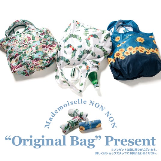 本フェアでは、期間中にマドモアゼルノンノンの商品を税込50,000円以上お買い上げいただいたお客様に、マドモアゼルノンノン オリジナルプリントバッグをプレゼントいたします。