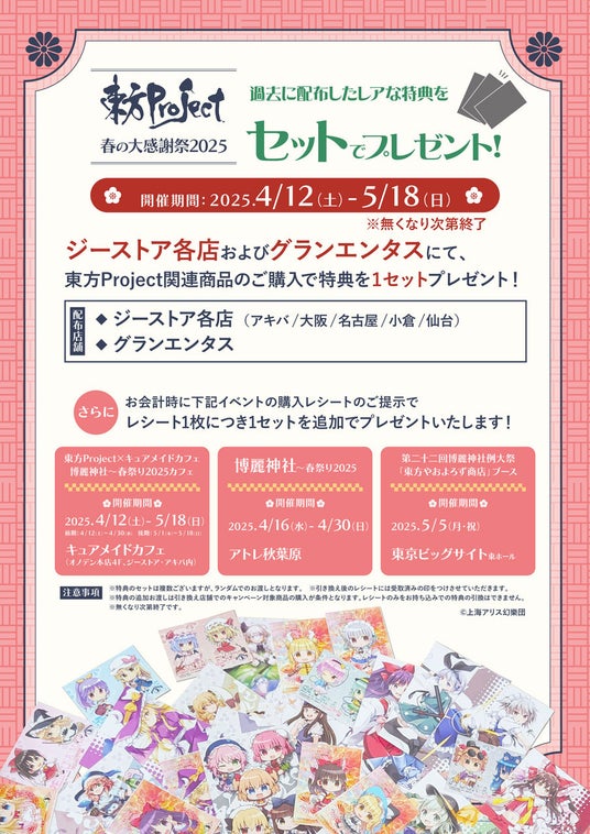 GEE!STORE(ジーストア)およびグランエンタス[オノデン 1F]で開催のキャンペーン《『東方Project』春の大感謝祭2025》では、期間中にジーストア各店、グランエンタスにて『東方Project』関連商品のご購入で特典を1セットプレゼント。