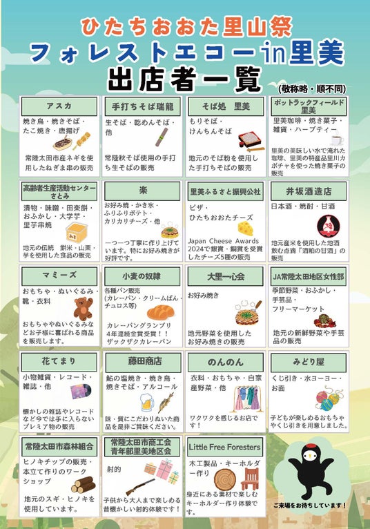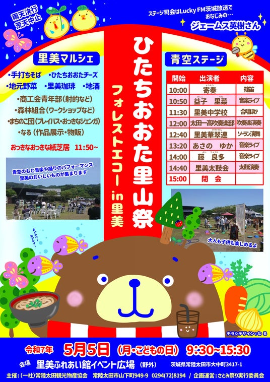 5月5日(月・祝)、里美ふれあい館イベント広場で「ひたちおおた里山祭~フォレストエコーin里美~」を開催します。地元野菜や地酒・チーズなどの特産品販売、地元のスギ・ヒノキを使用した本立てを作るワークショップ、また、イベント広場では、音楽ライブや太鼓演奏などのステージイベントを予定しています。自然豊かな里美の地で食べ物やすてきな人たち、すばらしい伝統文化に出会えるイベントです。ぜひ皆さまのご来場をお待ちしています。
