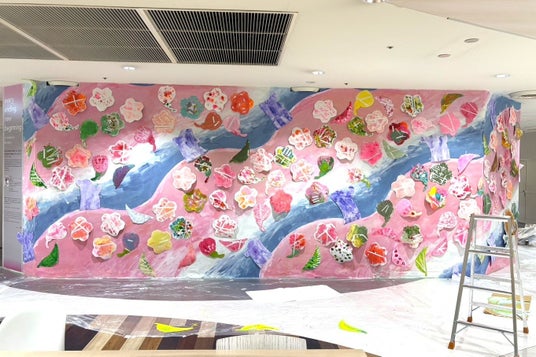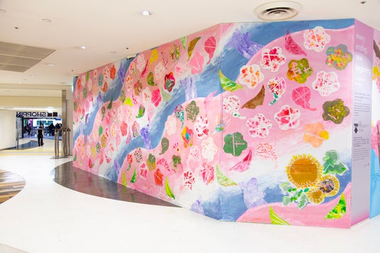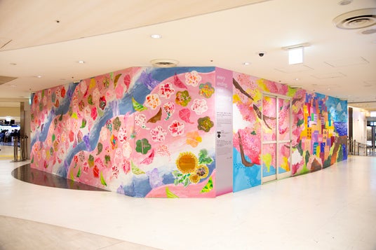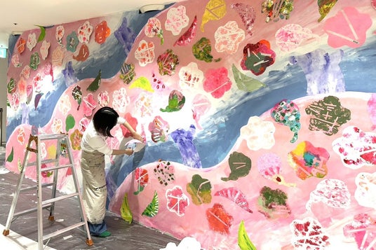 「旅立ちの希望と、再会のあたたかさ。子どもたちやアーティストが描いた桜の花びらが空間と調和し、その想いとともに訪れる人を迎え、彩りを与えます。」