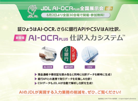【会計事務所の皆さまへ】「JDL AI-OCR PLUS全国展示会」6月2日より全国30会場で開催・参加無料!~証ひょうはAI-OCR、さらに銀行APIやCSVはAI仕訳。