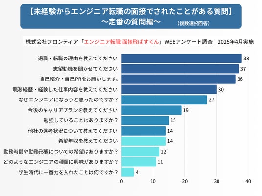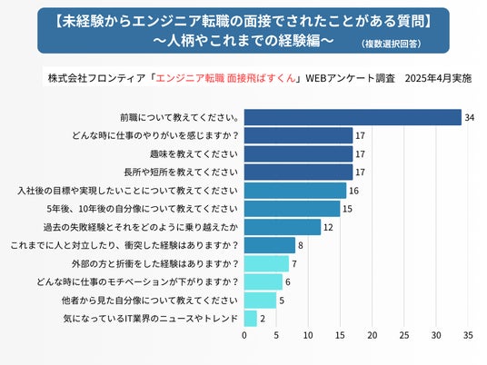 株式会社フロンティア(東京都品川区)は4月27日、未経験からエンジニア転職を目指す方に向けた支援サービス「エンジニア転職 面接飛ばすくん(https://mensetsu-tobaseru.com/)」において、面接時に聞かれる質問や不安要素を明らかにするためのアンケート調査を実施した結果を発表しました。