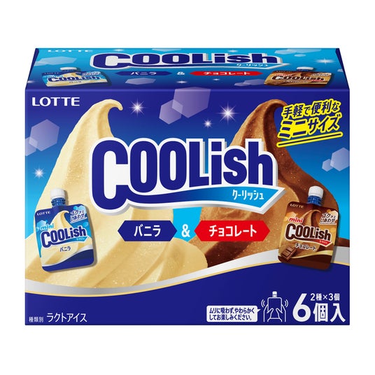 バニラとチョコレートの2種類が楽しめるアソートタイプのクーリッシュです。容量80mlのミニサイズが6個(2種×3個)入っています。