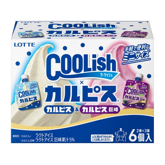 「カルピス」と「カルピス」巨峰の2種類が楽しめるアソートタイプのクーリッシュです。容量80mlのミニサイズが6個(2種×3個)入っています。「カルピス」は、アサヒ飲料(株)の登録商標です。
