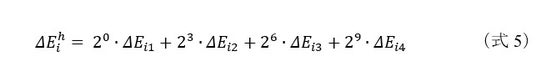 例として、各LSIのJijのビット幅を符号付き4ビットとします。従来のスケーラブル全結合型イジングマシンでは、この4ビットのまま、LSIの個数を増やす方法を取っていました。今回の新提案では、統合する1つのFPGAでLSIチップ4個からのエネルギーの和を計算するときに、単純に足し合わせるのではなく、事前にビットシフトを行います。この時の和をΔEihとすると、以下のように表すことができます。