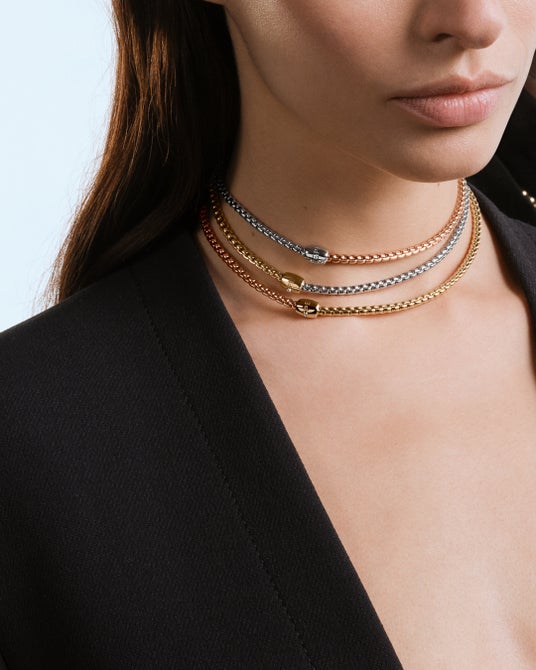 エカフレグジットネックレスは、革新的なシステムFLEX’ITにより首元で常に美しい円を描きます。D-CLICK(ディークリック)と呼ばれる、ダイヤモンドがセッティングされたボタンを押して開閉するFOPEオリジナルのクラスプはデザインの一部となり、首元に短めに沿わせたチョーカースタイルでも窮屈感はありません。チェーンのゲージは3種類。3カラーのゴールドとホワイトダイヤモンド、またはブラックダイヤモンドから選択できます。
