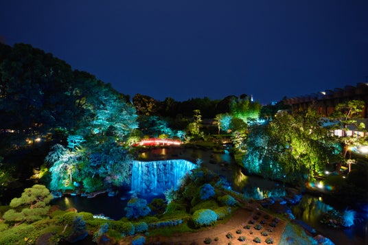 「ガーデンラウンジ」では、11:00~20:30と一日を通して提供する『マンゴーパフェ』。フルハイトウインドウからは、約1万坪の広大な日本庭園を望む絶景が広がり、日没ごろからは、季節をテーマにした没入感満点のライトアップをご覧いただけます。明るい時間のティータイムのお供としてはもちろん、お食事の最後のシメとして味わう「夜パフェ」としてお愉しみいただくのもおすすめです。