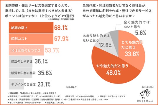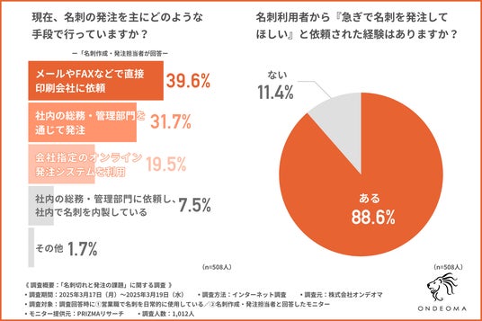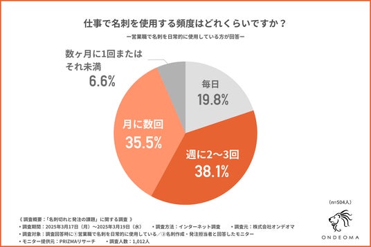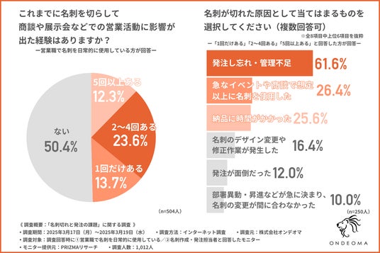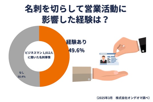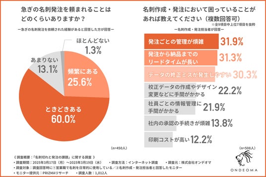 株式会社オンデオマ(本社:大阪府大阪市、代表取締役:福田 弘之)は、1.営業職で名刺を日常的に使用している方/2.名刺作成・発注担当者を対象に、「名刺切れと発注の課題」に関する調査を実施しました。
