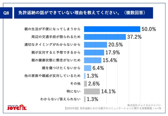 Q5で「できていない」と回答した方に、「Q8.免許返納の話ができていない理由を教えてください。(複数回答)」(n=78)と質問したところ、「親の生活が不便になってしまうから」が50.0%、「周辺の交通手段が限られるため」が37.2%、「適切なタイミングがわからないから」が20.5%という回答となりました。