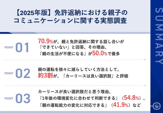 【2025年版|免許返納における親子のコミュニケーション調査】70.9%が「免許返納の話ができていない」実態 親の運転を徐々に減らしていく方法として、約3割が「カーリース」を評価