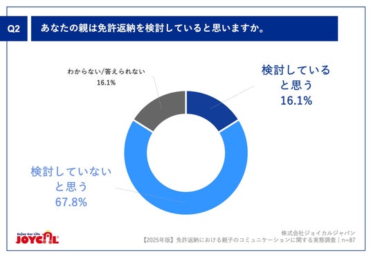 Q1で「していない」と回答した方に、「Q2.あなたの親は免許返納を検討していると思いますか。」(n=87)と質問したところ、「検討していると思う」が16.1%、「検討していないと思う」が67.8%という回答となりました。