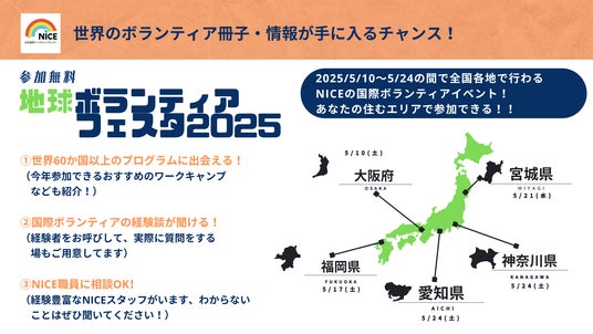 NPO法人NICE(日本国際ワークキャンプセンター)(所在地:神奈川県横浜市戸塚区、代表:開澤真一郎)は、世界中で開催されるボランティア情報を提供するイベント「地球ボランティア・フェスタ」を、神奈川県横浜市・大阪府大阪市・愛知県名古屋市・福岡県福岡市・宮城県仙台市内の5都市で開催します。