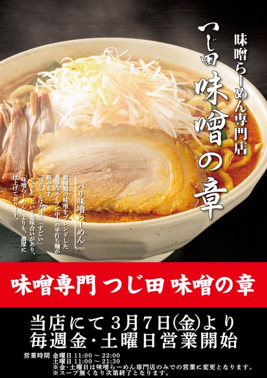 つじ田 肥後橋店、週末(金・土)限定で味噌ラーメン専門店 「つじ田 味噌の章」ご好評につき販売延長!