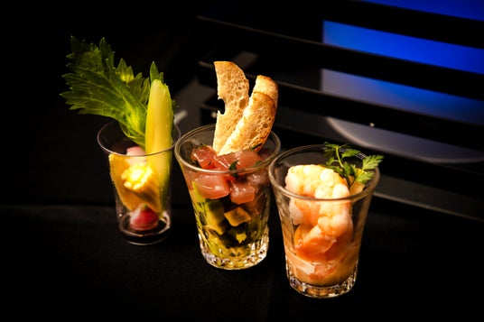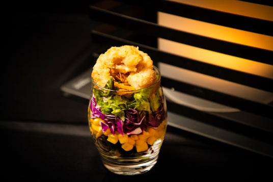 アメリカンダイナーの定番・冷製アペタイザーをアジアンテイストにアレンジ。カリッと揚げたイカを香味野菜とともに爽やかに仕上げ、ピリ辛のシラチャーソース入りディップが絶妙なアクセントに。カップスタイルで提供。