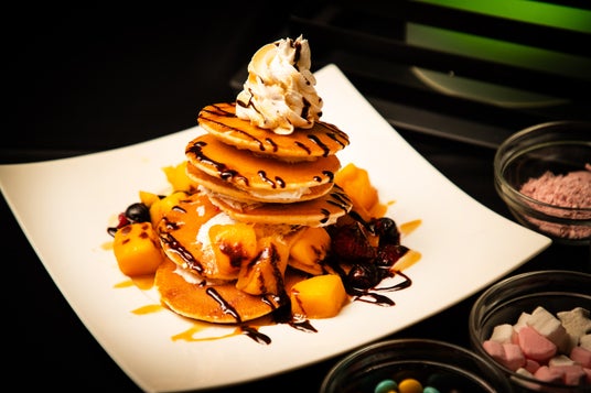 お客様ご自身でカスタマイズできるパンケーキです。色とりどりのトッピングやお好みのソースを使って、世界にひとつだけのオリジナルパンケーキをお楽しみください。