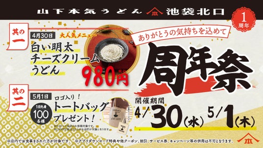 期間中に「山下本気うどん 池袋北口」でご来店いただいたお客様を対象に、4月30日は白い明太チーズクリームうどんを980円(税込)で提供し、5月1日は先着100名様限定で、山下本気うどんオリジナルトートバックをプレゼントいたします※2。
