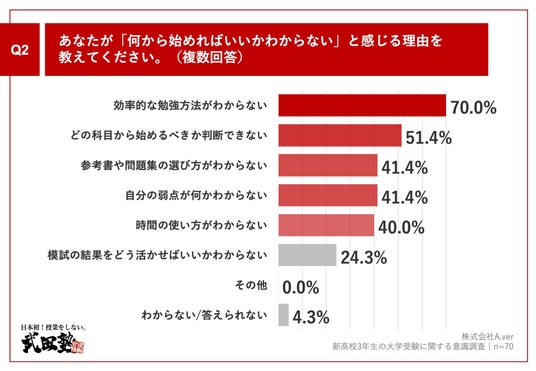 Q1で「非常にそう感じる」「ややそう感じる」と回答した方に、「Q2.あなたが『何から始めればいいかわからない』と感じる理由を教えてください。(複数回答)」(n=70)と質問したところ、「効率的な勉強方法がわからない」が70.0%、「どの科目から始めるべきか判断できない」が51.4%という回答となりました。