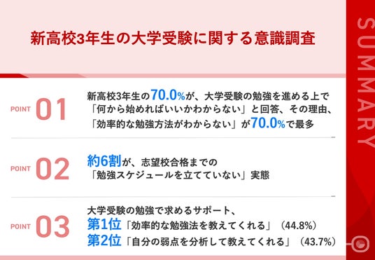- 01|新高校3年生の70.0%が、大学受験の勉強を進める上で「何から始めればいいかわからない」 と回答、その理由、「効率的な勉強方法がわからない」が70.0%で最多
