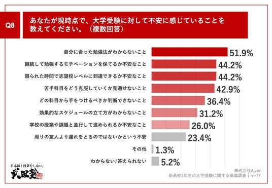 Q7で「かなり不安がある」「やや不安がある」と回答した方に、「Q8.あなたが現時点で、大学受験に対して不安に感じていることを教えてください。(複数回答)」(n=77)と質問したところ、「自分に合った勉強法がわからないこと」が51.9%、「継続して勉強するモチベーションを保てるか不安なこと」が44.2%、「限られた時間で志望校レベルに到達できるか不安なこと」が44.2%という回答となりました。