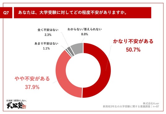 Q1で「大学受験はしない」以外を回答した方に、「Q7.あなたは、大学受験に対してどの程度不安がありますか。」(n=87)と質問したところ、「かなり不安がある」が50.7%、「やや不安がある」が37.9%という回答となりました。