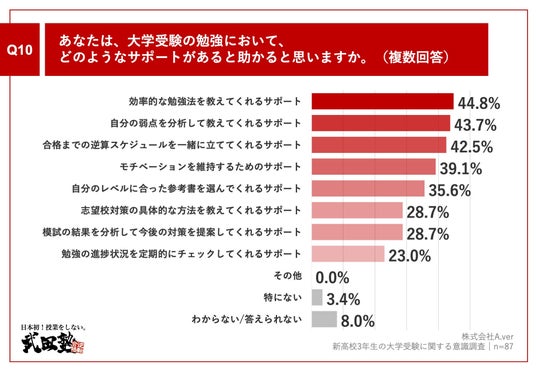 Q1で「大学受験はしない」以外を回答した方に、「Q10.あなたは、大学受験の勉強において、どのようなサポートがあると助かると思いますか。(複数回答)」(n=87)と質問したところ、「効率的な勉強法を教えてくれるサポート」が44.8%、「自分の弱点を分析して教えてくれるサポート」が43.7%、「合格までの逆算スケジュールを一緒に立ててくれるサポート」が42.5%という回答となりました。