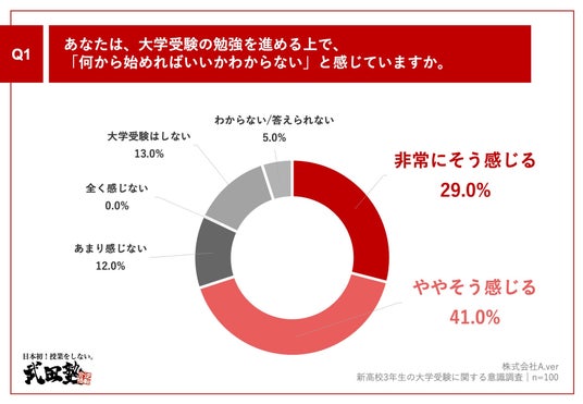 「Q1.あなたは、大学受験の勉強を進める上で、『何から始めればいいかわからない』と感じていますか。」(n=100)と質問したところ、「非常にそう感じる」が29.0%、「ややそう感じる」が41.0%という回答となりました。