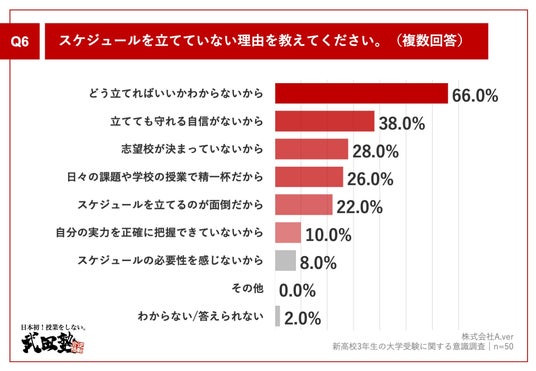 Q5で「いいえ」と回答した方に、「Q6.スケジュールを立てていない理由を教えてください。(複数回答)」(n=50)と質問したところ、「どう立てればいいかわからないから」が66.0%、「立てても守れる自信がないから」が38.0%、「志望校が決まっていないから」が28.0%という回答となりました。